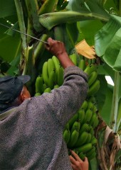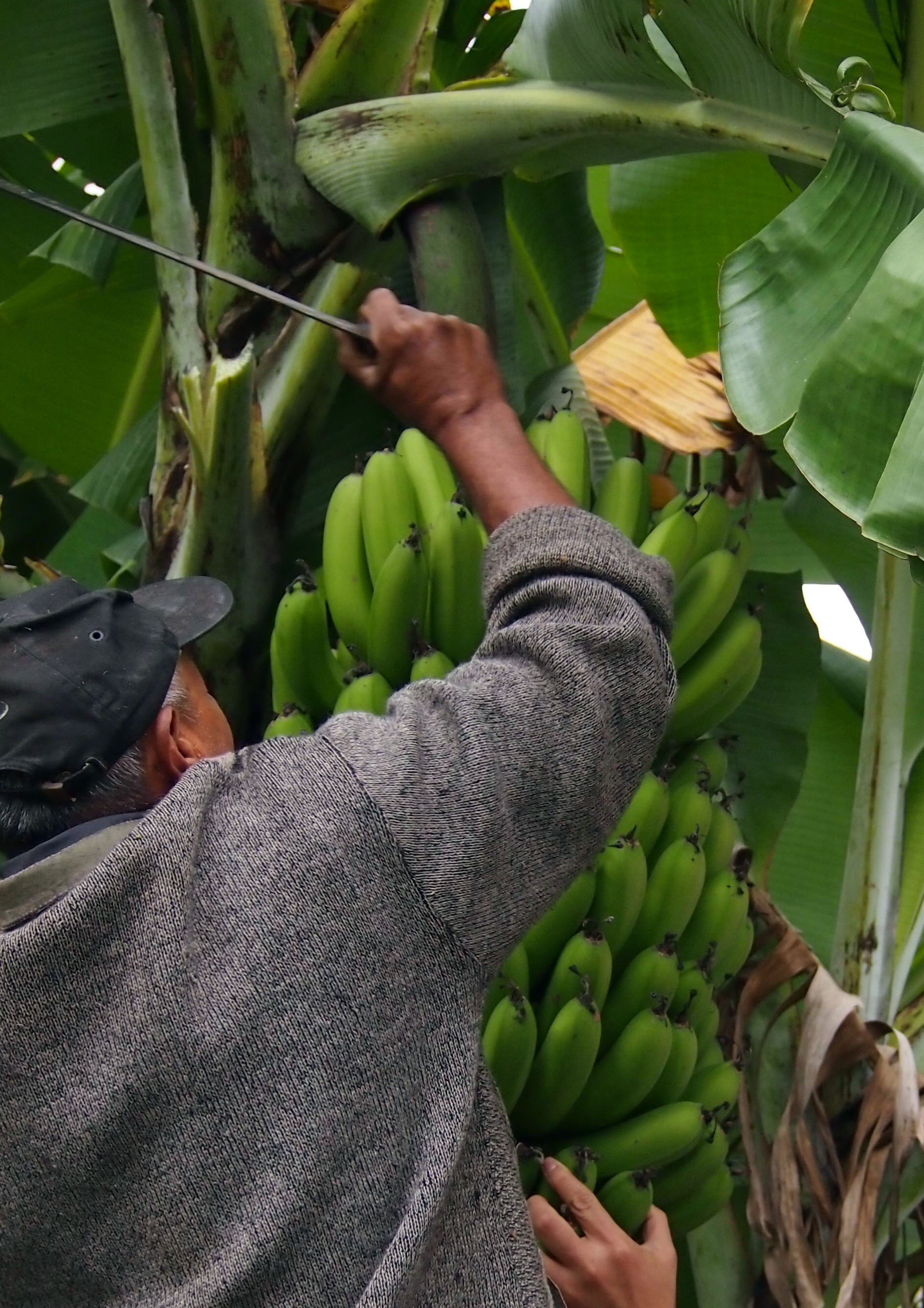 バナナの収穫の様子です。なたのようなもので茎をばっさりと。 |